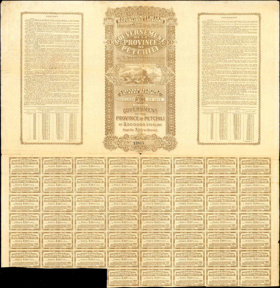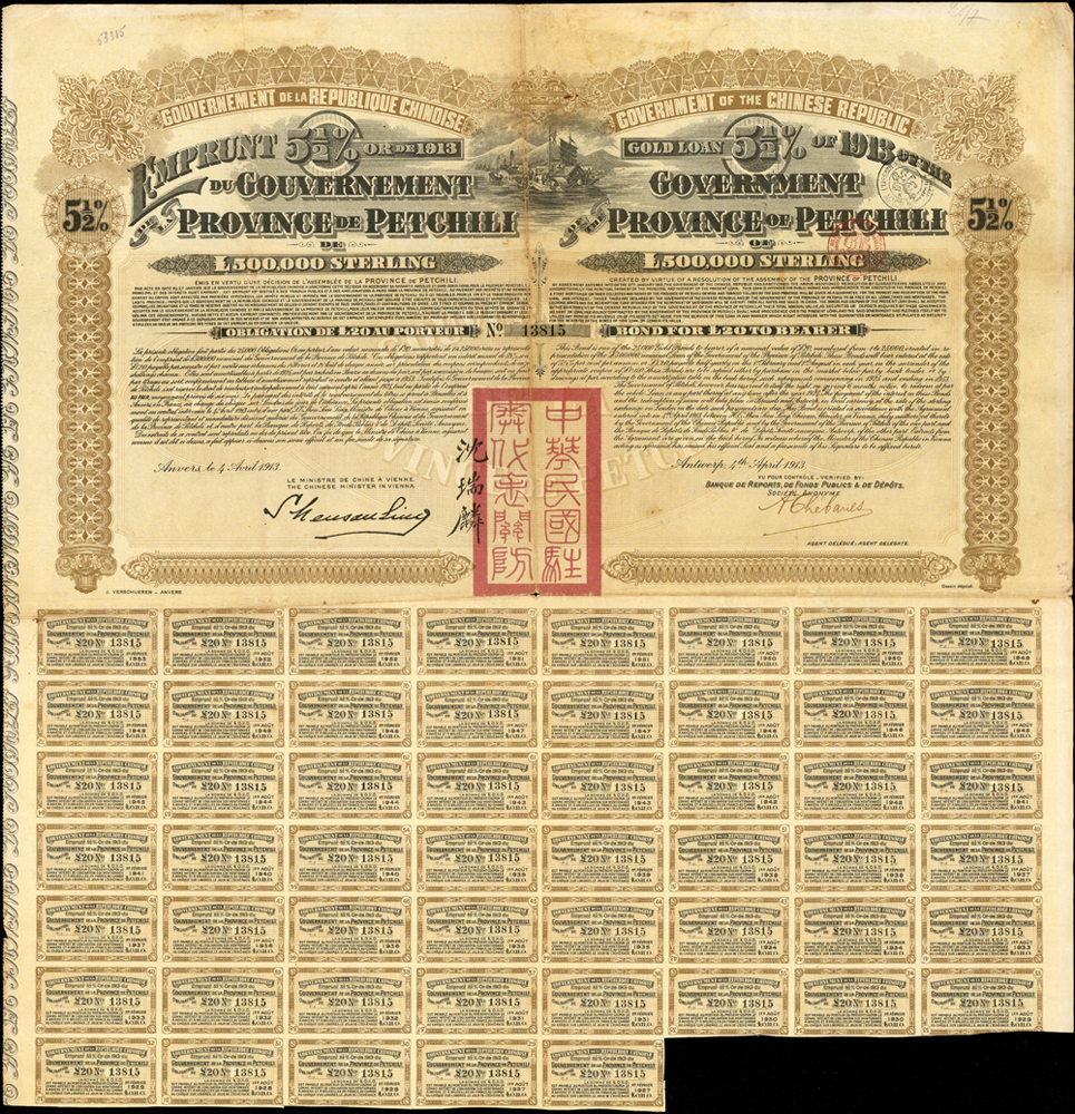 紙鈔分類 中國紙鈔清代~紙幣/股票/債券(8310-8323)『楊展孝』收藏~中央銀行銀元兑換券(8324-8380)民國~中央銀行紙幣(8381-8424)民國~中國銀行(8425-8448)民國~交通銀行(8449-8459)民國~中國農民銀行(8460-8462)民國~各省銀行券(8463-8491)民國~軍用鈔票(8492-8504)民國~地方券/錢莊票(8505-8510)民國~偽政權紙幣(8511-8519)民國金融票證~債券/股票(8520-8543)臺灣銀行~日治時期(8544-8552)臺灣銀行~老台幣(8553-8577)臺灣銀行~新台幣(8578-8679)臺灣銀行~限金門/限馬祖通用(8680-8694)臺灣銀行~限大陳島通用(8695-8696)臺灣/中央銀行~趣味號(8697-8706)中央銀行~三連鈔(8707-8709)臺灣各式金融票證(8710-8715)日本『山崎 修之亮』收藏~中國及外國紙幣(8716-8738)新中國紙幣解放區時期紙幣/債券(8739-8740)中國人民銀行~各版人民幣/外匯券/金融票證(8741-8759)世界各國紙幣日本紙幣(8760-8773)世界各國紙幣(A~Z)(8774-8783) 中國紙鈔 ↳清代~紙幣/股票/債券(8310-8323) ↳『楊展孝』收藏~中央銀行銀元兑換券(8324-8380) ↳民國~中央銀行紙幣(8381-8424) ↳民國~中國銀行(8425-8448) ↳民國~交通銀行(8449-8459) ↳民國~中國農民銀行(8460-8462) ↳民國~各省銀行券(8463-8491) ↳民國~軍用鈔票(8492-8504) ↳民國~地方券/錢莊票(8505-8510) ↳民國~偽政權紙幣(8511-8519) ↳民國金融票證~債券/股票(8520-8543) ↳臺灣銀行~日治時期(8544-8552) ↳臺灣銀行~老台幣(8553-8577) ↳臺灣銀行~新台幣(8578-8679) ↳臺灣銀行~限金門/限馬祖通用(8680-8694) ↳臺灣銀行~限大陳島通用(8695-8696) ↳臺灣/中央銀行~趣味號(8697-8706) ↳中央銀行~三連鈔(8707-8709) ↳臺灣各式金融票證(8710-8715) ↳日本『山崎 修之亮』收藏~中國及外國紙幣(8716-8738)新中國紙幣 ↳解放區時期紙幣/債券(8739-8740) ↳中國人民銀行~各版人民幣/外匯券/金融票證(8741-8759)世界各國紙幣 ↳日本紙幣(8760-8773) ↳世界各國紙幣(A~Z)(8774-8783) 點大圖放大展示,點小圖切換 1913年中華民國政府對外發行直隸省金鎊債券(52*53.2cm)20英鎊,蓋有中華民國駐奧地利關防和駐奧地利公使沈瑞麟簽名,附部分息票,十字折,77新(Page 64) 結標時間 2025-12-16 12:53:20 拍品編號:8521 起拍價:NT$100 當前價:NT$100 自動出價 直接出價 出價 系統將按出價級數,依序為您比(出)價至上限金額 提醒您:直接出價後不可將金額改低,只能改高,蟠龍無法降低您的出價,最高出價者無法取消出價 (查看出價說明) 得標說明:需按得標價另加10%佣金 當前加價幅度:NT$0元 (查看加價級數表) 回上頁 線上出價記錄 線上 0 人次,書面 0 人次 競價客戶 所在地 出價時間 出價金額 出價方式 問與答 目前尚無提問 我要提問 請先登入會員