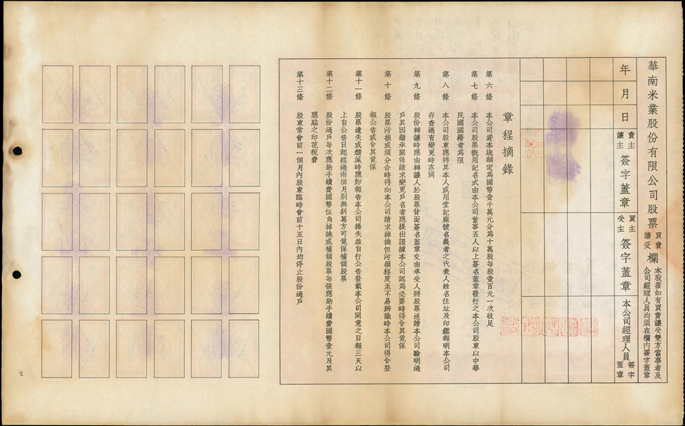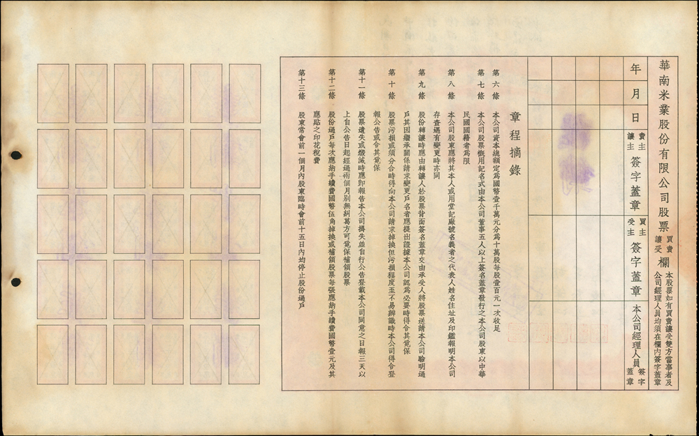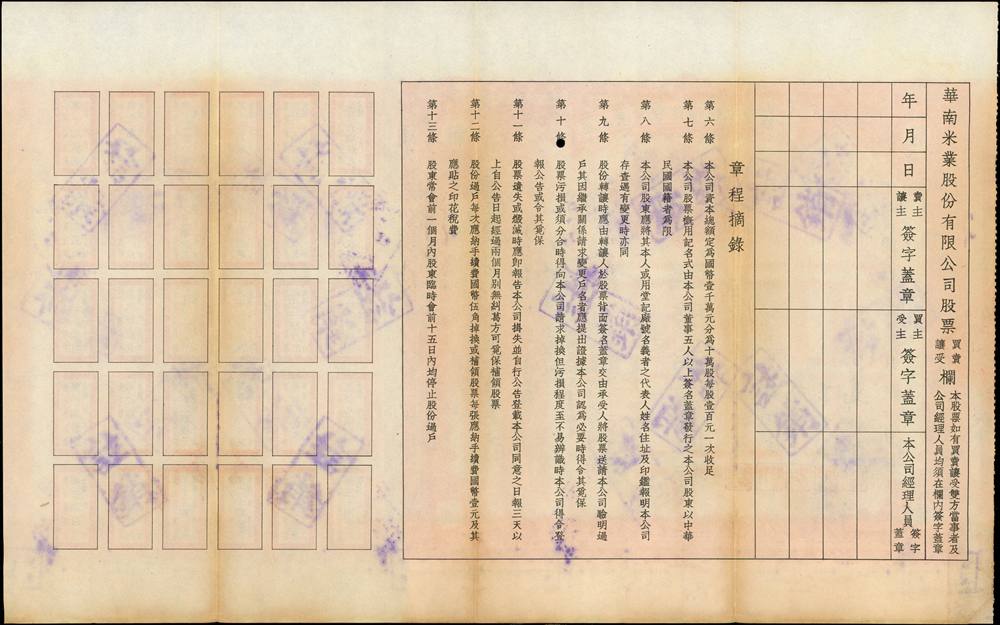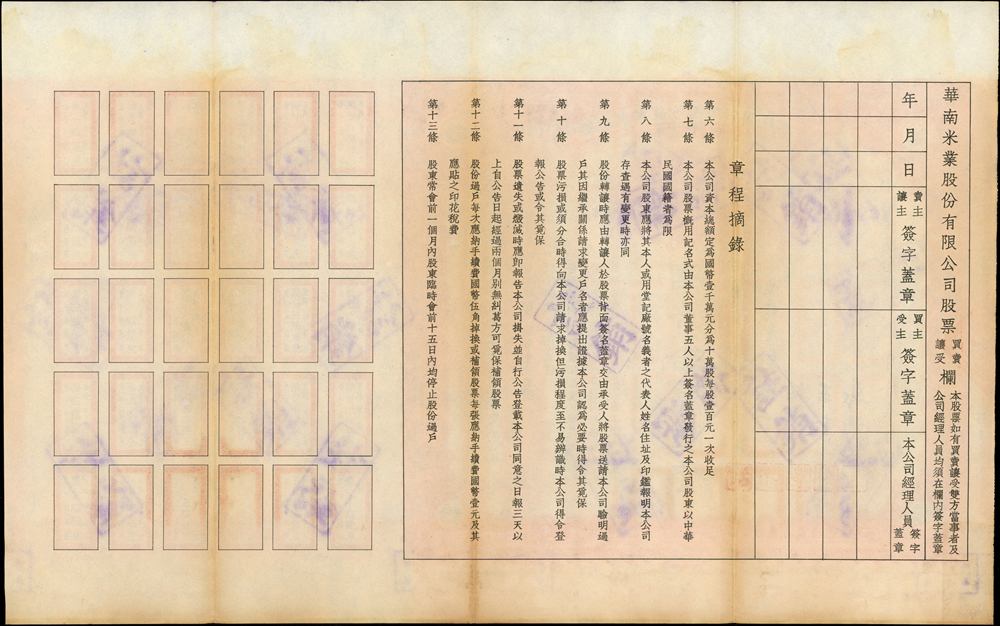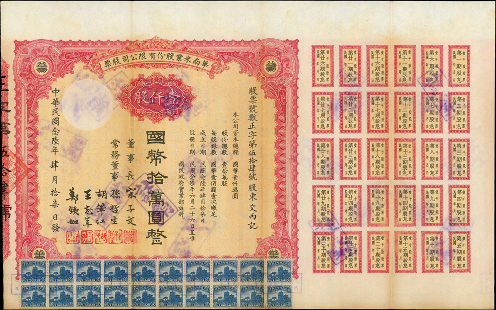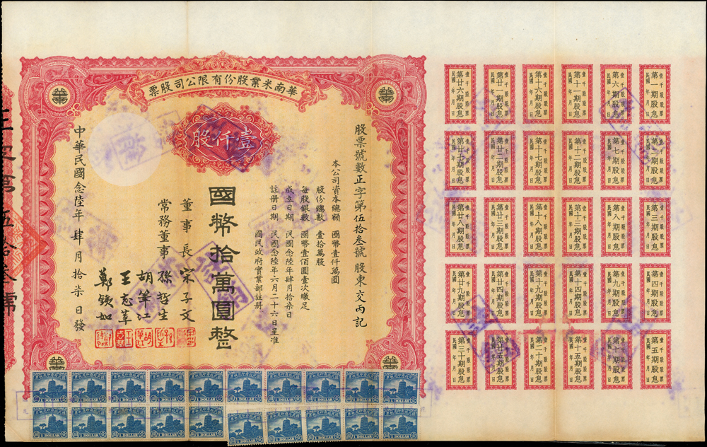 民國26年華南米業股份有限公司股票7張,包括:(1)壹仟股國幣拾萬圓2張,息票完整,董事長宋子文,貼有六和塔圖壹元印花,銷『印花貼足』及註銷章,三折,80新;(2)壹股國幣壹佰圓1張,拾股國幣壹仟圓2張,壹佰股國幣壹萬圓1張,壹仟股國幣拾萬圓1張,均息票完整,董事長宋子文,未貼印花,蓋註銷章,正面上方載明轉移股權事宜毛筆字,右邊紙均有裝訂孔,對折,80新(Page 66)