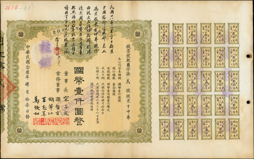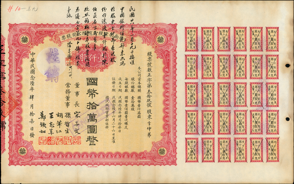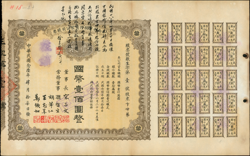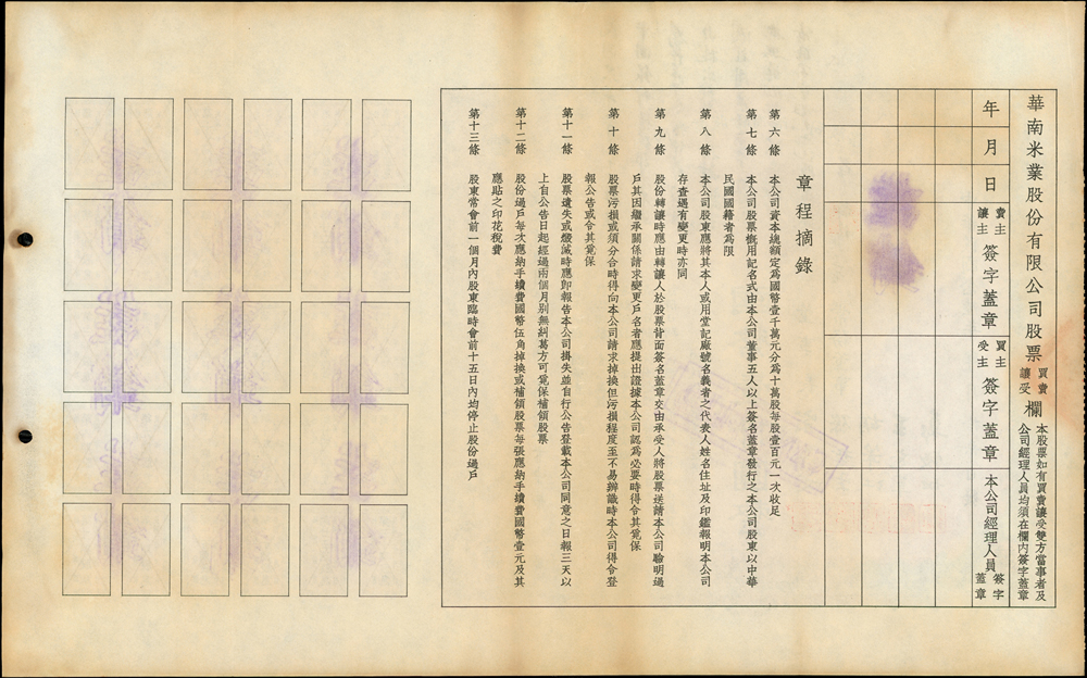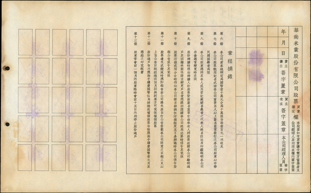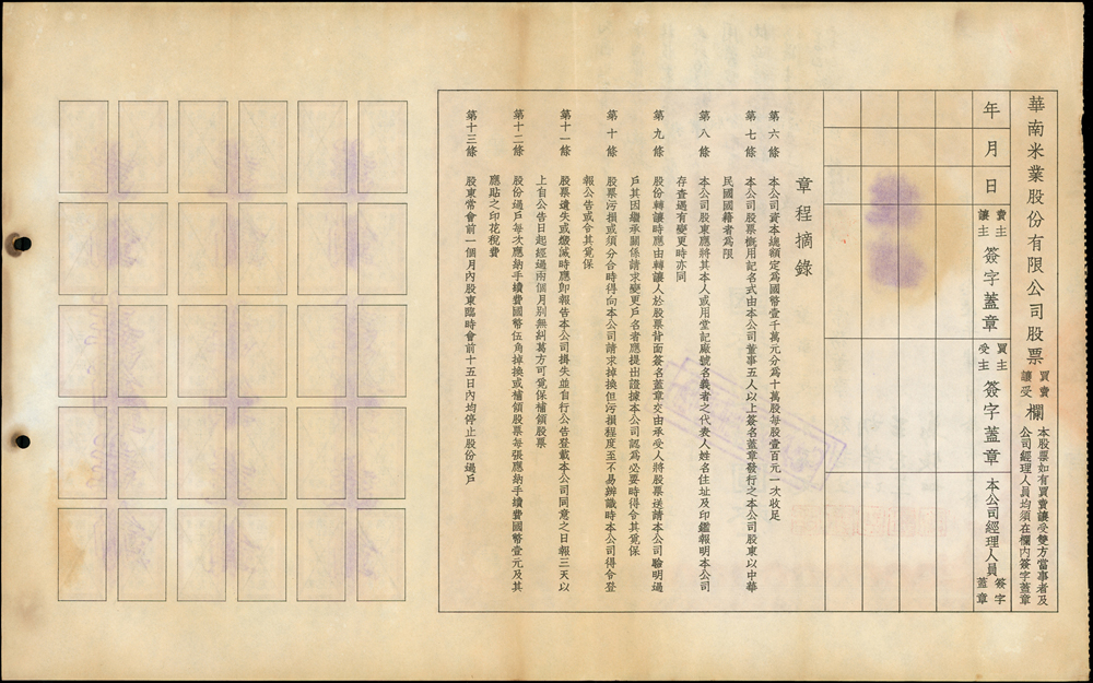 民國26年華南米業股份有限公司股票7張,包括:(1)壹仟股國幣拾萬圓2張,息票完整,董事長宋子文,貼有六和塔圖壹元印花,銷『印花貼足』及註銷章,三折,80新;(2)壹股國幣壹佰圓1張,拾股國幣壹仟圓2張,壹佰股國幣壹萬圓1張,壹仟股國幣拾萬圓1張,均息票完整,董事長宋子文,未貼印花,蓋註銷章,正面上方載明轉移股權事宜毛筆字,右邊紙均有裝訂孔,對折,80新(Page 66)