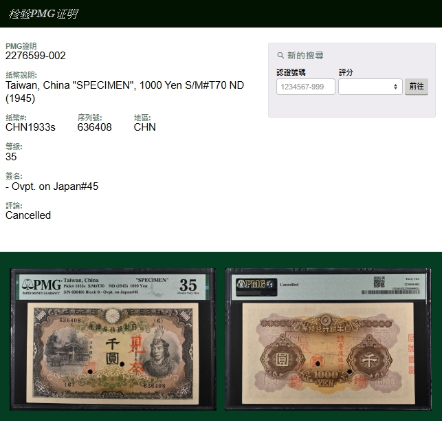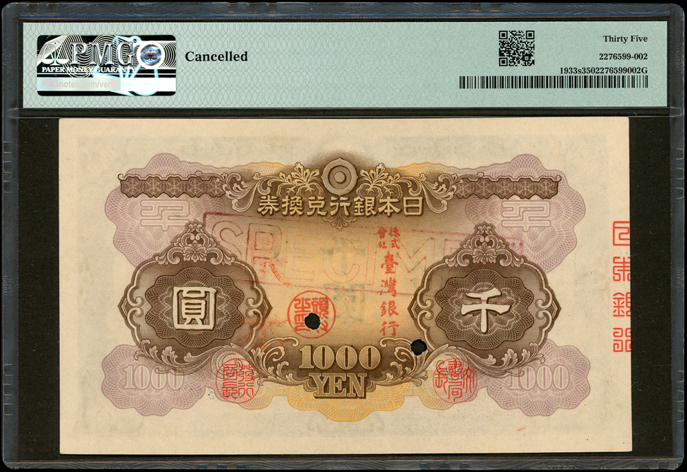 樣張:臺灣銀行武尊千圓券,組號{6},稀少,PMG Choice Very Fine35 註:第二次世界大戰末期,即民國34年(昭和20年)7月後,日本政府為復員需要,由日本國內原行使之日銀千圓券(日本武尊),經東京空運來台北,再經台灣銀行在券反面正中右旁加蓋直書『株式會社臺灣銀行』及左旁下圓型『頭取之印』章戳,發行流通。但該券與各種面額之日本銀行券(日銀券),於民國34年11月經我政府下令凍結,作為「臺銀特種定期存款」處理。期限內若不依規定存入,時間過後將全部失效。由於施行「臺銀券特種定期存款」政策,因此『武尊千圓券』實際在市面流通的時間只有81天左右,發行總額據《臺灣光復前貨幣史述》一書由官方公布的資料得知,共計七億八千四百二十八萬元。(Page 67)