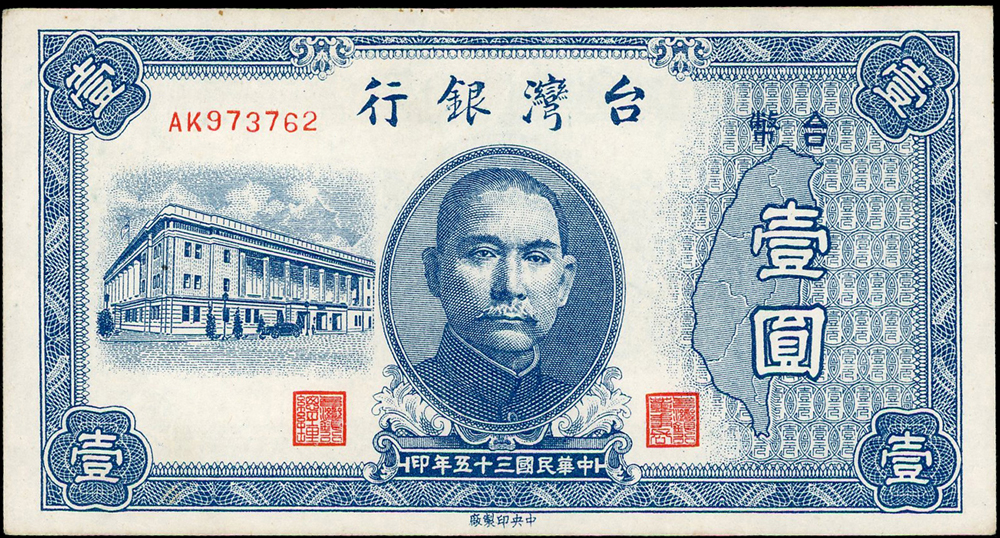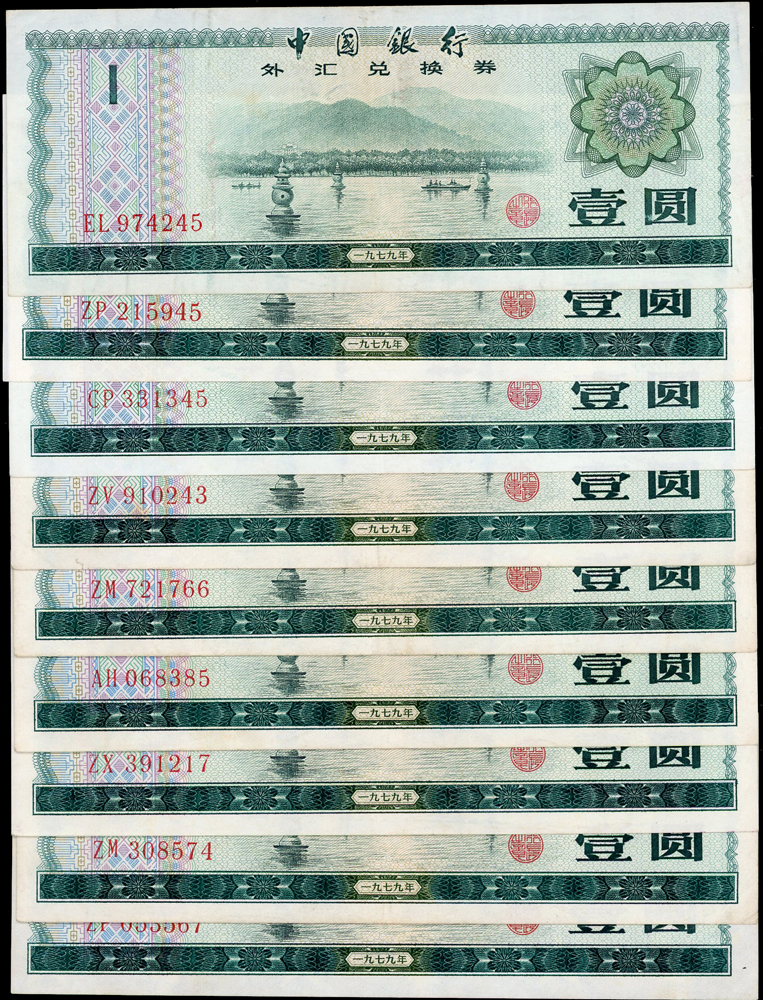 兩岸鈔券:(1)台灣老台幣民國35年1元.10元各1枚,85-90新;金門民國58年50元,數折,70新;(2)中國銀行外匯券:1979年1元16枚.5角3枚.1角14枚,其中1元約8枚中折,其餘無折,80-全新