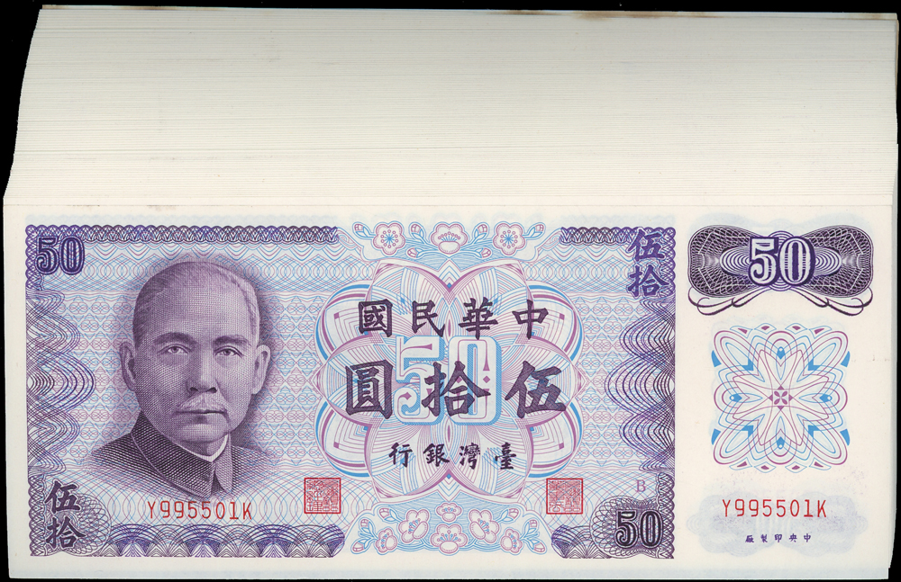 臺灣銀行民國61年50元B記連號100枚(Y995501K~Y995600K),其中19枚帶3,含多枚特殊號:Y995555K.Y995511K.Y995599K等,其中最後5枚局部黃斑,其餘97-全新(Page 73)
