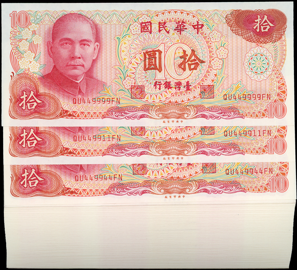 臺灣銀行民國65年10元連號100枚(QU449901FN~QU450000FN),其中19枚帶3,含多枚特殊號:QU449999FN.QU449911FN.QU449944FN等,97-全新(Page 74)