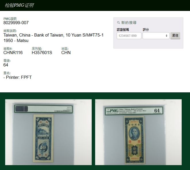 紙鈔分類 中國紙鈔清代~紙幣/股票/債券(8310-8323)『楊展孝』收藏~中央銀行銀元兑換券(8324-8380)民國~中央銀行紙幣(8381-8424)民國~中國銀行(8425-8448)民國~交通銀行(8449-8459)民國~中國農民銀行(8460-8462)民國~各省銀行券(8463-8491)民國~軍用鈔票(8492-8504)民國~地方券/錢莊票(8505-8510)民國~偽政權紙幣(8511-8519)民國金融票證~債券/股票(8520-8543)臺灣銀行~日治時期(8544-8552)臺灣銀行~老台幣(8553-8577)臺灣銀行~新台幣(8578-8679)臺灣銀行~限金門/限馬祖通用(8680-8694)臺灣銀行~限大陳島通用(8695-8696)臺灣/中央銀行~趣味號(8697-8706)中央銀行~三連鈔(8707-8709)臺灣各式金融票證(8710-8715)日本『山崎 修之亮』收藏~中國及外國紙幣(8716-8738)新中國紙幣解放區時期紙幣/債券(8739-8740)中國人民銀行~各版人民幣/外匯券/金融票證(8741-8759)世界各國紙幣日本紙幣(8760-8773)世界各國紙幣(A~Z)(8774-8783) 中國紙鈔 ↳清代~紙幣/股票/債券(8310-8323) ↳『楊展孝』收藏~中央銀行銀元兑換券(8324-8380) ↳民國~中央銀行紙幣(8381-8424) ↳民國~中國銀行(8425-8448) ↳民國~交通銀行(8449-8459) ↳民國~中國農民銀行(8460-8462) ↳民國~各省銀行券(8463-8491) ↳民國~軍用鈔票(8492-8504) ↳民國~地方券/錢莊票(8505-8510) ↳民國~偽政權紙幣(8511-8519) ↳民國金融票證~債券/股票(8520-8543) ↳臺灣銀行~日治時期(8544-8552) ↳臺灣銀行~老台幣(8553-8577) ↳臺灣銀行~新台幣(8578-8679) ↳臺灣銀行~限金門/限馬祖通用(8680-8694) ↳臺灣銀行~限大陳島通用(8695-8696) ↳臺灣/中央銀行~趣味號(8697-8706) ↳中央銀行~三連鈔(8707-8709) ↳臺灣各式金融票證(8710-8715) ↳日本『山崎 修之亮』收藏~中國及外國紙幣(8716-8738)新中國紙幣 ↳解放區時期紙幣/債券(8739-8740) ↳中國人民銀行~各版人民幣/外匯券/金融票證(8741-8759)世界各國紙幣 ↳日本紙幣(8760-8773) ↳世界各國紙幣(A~Z)(8774-8783) 點大圖放大展示,點小圖切換 13 臺灣銀行馬祖民國39年10元第一廠,HS字軌帶圓3,PMG Choice Uncirculated 64(Page 77) 結標時間 2025-12-16 13:50:40 拍品編號:8693 起拍價:NT$40000 當前價:NT$40000 自動出價 直接出價 出價 系統將按出價級數,依序為您比(出)價至上限金額 提醒您:直接出價後不可將金額改低,只能改高,蟠龍無法降低您的出價,最高出價者無法取消出價 (查看出價說明) 得標說明:需按得標價另加10%佣金 當前加價幅度:NT$0元 (查看加價級數表) 回上頁 線上出價記錄 線上 0 人次,書面 0 人次 競價客戶 所在地 出價時間 出價金額 出價方式 問與答 目前尚無提問 我要提問 請先登入會員