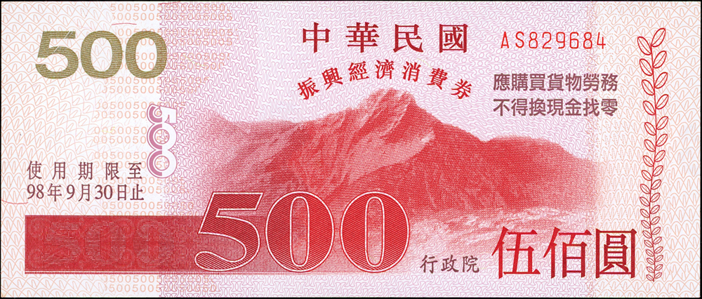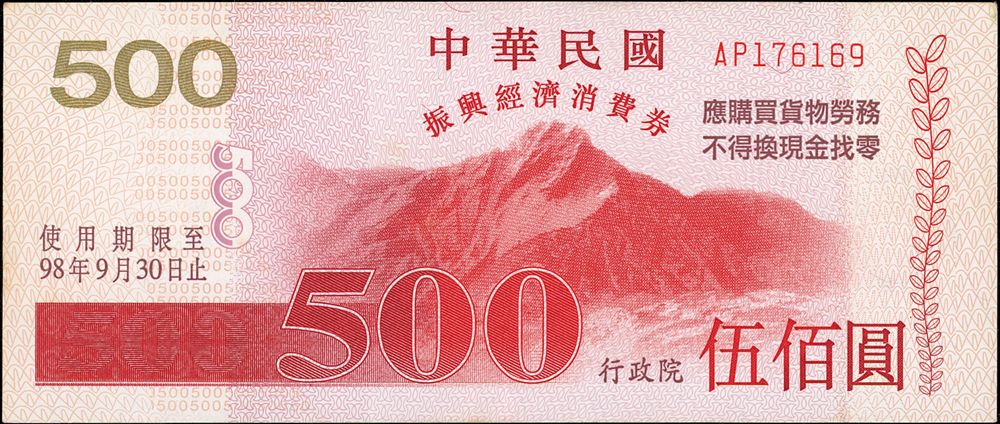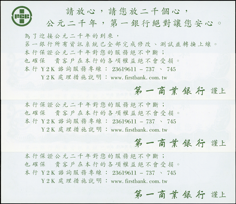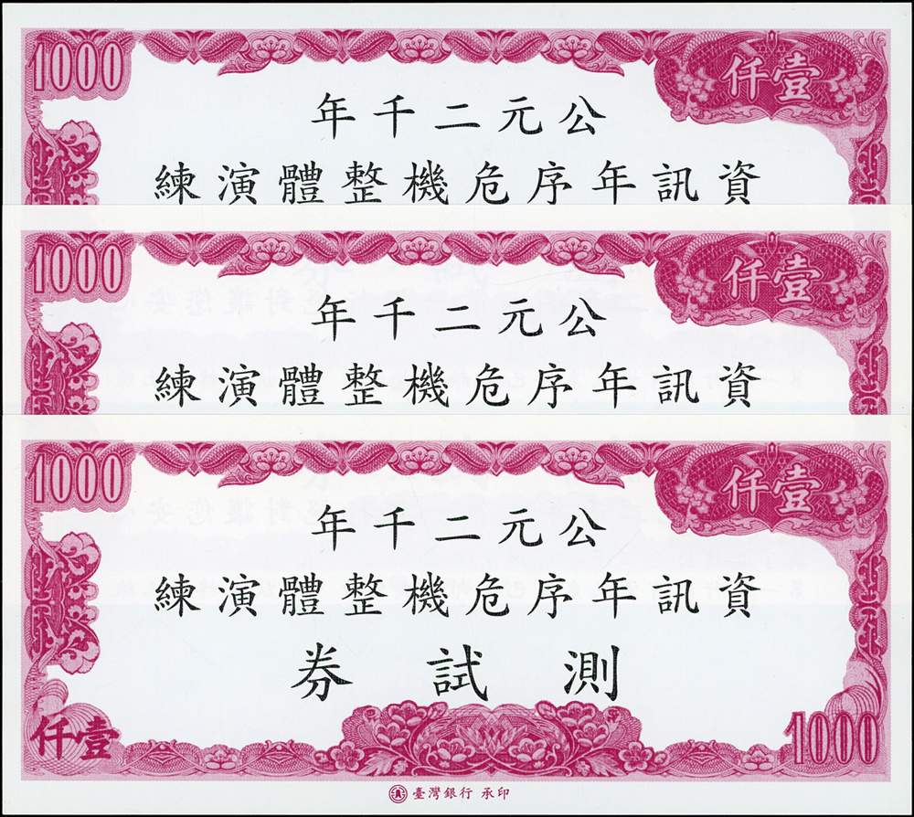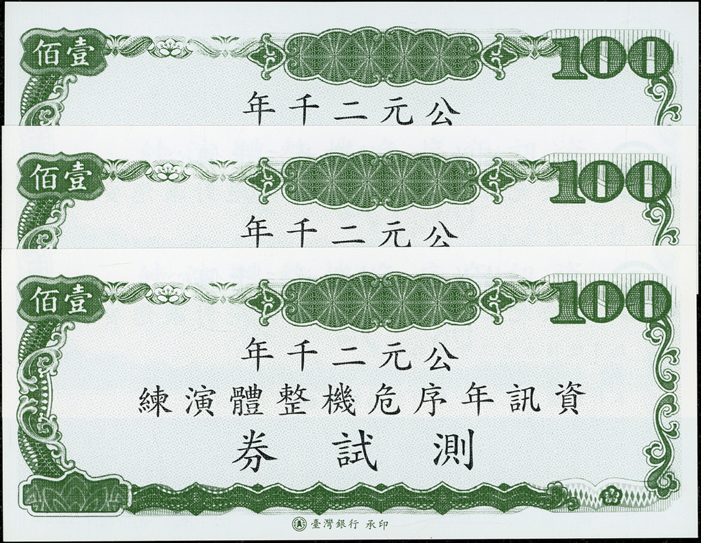 台灣票券:(1)2009年振興經濟消費券200元(左側一道銹痕)1張,500元2張,85-90新;(2)第一銀行公元二千年資訊年序危機整體演練測試券100元及1000元各3張,共6張,全新;贈練功券9張(Page 79)