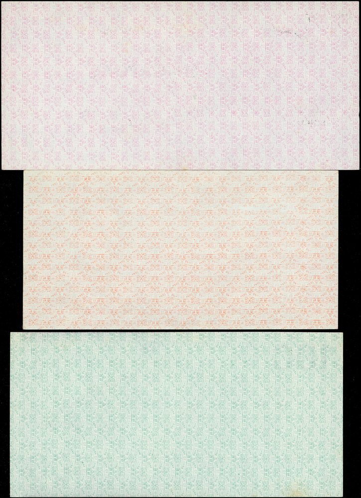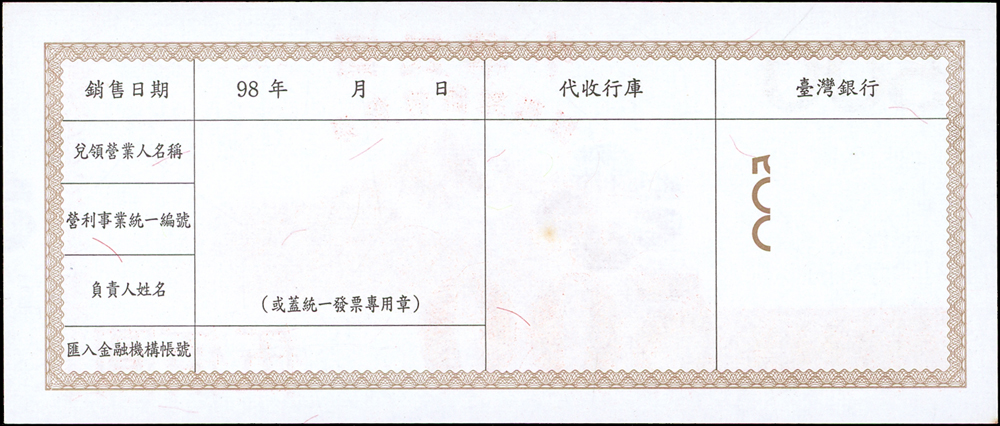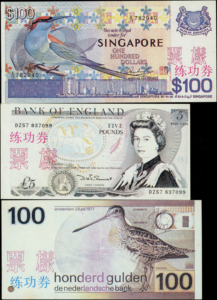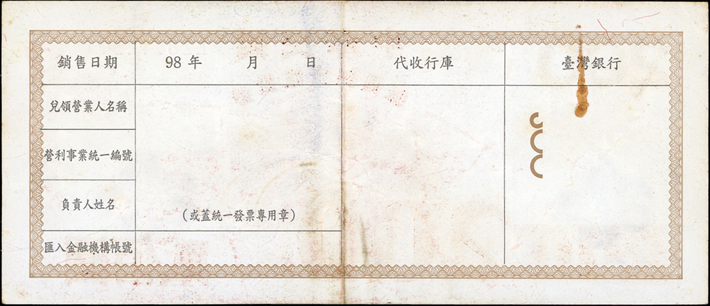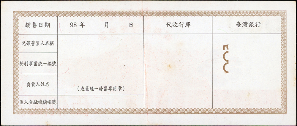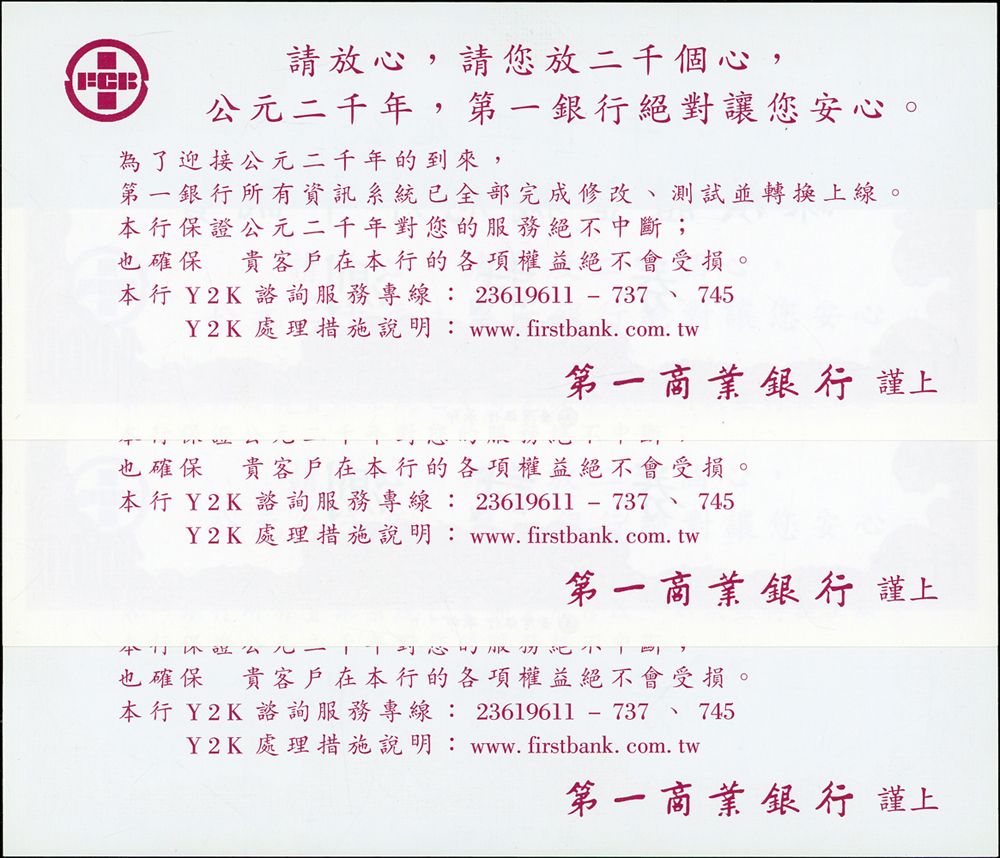 台灣票券:(1)2009年振興經濟消費券200元(左側一道銹痕)1張,500元2張,85-90新;(2)第一銀行公元二千年資訊年序危機整體演練測試券100元及1000元各3張,共6張,全新;贈練功券9張(Page 79)