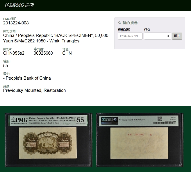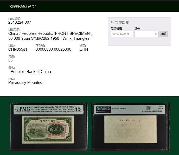 紙鈔分類 中國紙鈔清代~紙幣/股票/債券(8310-8323)『楊展孝』收藏~中央銀行銀元兑換券(8324-8380)民國~中央銀行紙幣(8381-8424)民國~中國銀行(8425-8448)民國~交通銀行(8449-8459)民國~中國農民銀行(8460-8462)民國~各省銀行券(8463-8491)民國~軍用鈔票(8492-8504)民國~地方券/錢莊票(8505-8510)民國~偽政權紙幣(8511-8519)民國金融票證~債券/股票(8520-8543)臺灣銀行~日治時期(8544-8552)臺灣銀行~老台幣(8553-8577)臺灣銀行~新台幣(8578-8679)臺灣銀行~限金門/限馬祖通用(8680-8694)臺灣銀行~限大陳島通用(8695-8696)臺灣/中央銀行~趣味號(8697-8706)中央銀行~三連鈔(8707-8709)臺灣各式金融票證(8710-8715)日本『山崎 修之亮』收藏~中國及外國紙幣(8716-8738)新中國紙幣解放區時期紙幣/債券(8739-8740)中國人民銀行~各版人民幣/外匯券/金融票證(8741-8759)世界各國紙幣日本紙幣(8760-8773)世界各國紙幣(A~Z)(8774-8783) 中國紙鈔 ↳清代~紙幣/股票/債券(8310-8323) ↳『楊展孝』收藏~中央銀行銀元兑換券(8324-8380) ↳民國~中央銀行紙幣(8381-8424) ↳民國~中國銀行(8425-8448) ↳民國~交通銀行(8449-8459) ↳民國~中國農民銀行(8460-8462) ↳民國~各省銀行券(8463-8491) ↳民國~軍用鈔票(8492-8504) ↳民國~地方券/錢莊票(8505-8510) ↳民國~偽政權紙幣(8511-8519) ↳民國金融票證~債券/股票(8520-8543) ↳臺灣銀行~日治時期(8544-8552) ↳臺灣銀行~老台幣(8553-8577) ↳臺灣銀行~新台幣(8578-8679) ↳臺灣銀行~限金門/限馬祖通用(8680-8694) ↳臺灣銀行~限大陳島通用(8695-8696) ↳臺灣/中央銀行~趣味號(8697-8706) ↳中央銀行~三連鈔(8707-8709) ↳臺灣各式金融票證(8710-8715) ↳日本『山崎 修之亮』收藏~中國及外國紙幣(8716-8738)新中國紙幣 ↳解放區時期紙幣/債券(8739-8740) ↳中國人民銀行~各版人民幣/外匯券/金融票證(8741-8759)世界各國紙幣 ↳日本紙幣(8760-8773) ↳世界各國紙幣(A~Z)(8774-8783) 點大圖放大展示,點小圖切換 6 樣票:中國人民銀行一版人民幣1950年5萬元收割機圖,正.背面圖各1枚,均評級:PMG About Uncirculated 55(Page 88) 結標時間 2025-12-16 14:08:00 拍品編號:8745 起拍價:NT$33000 當前價:NT$33000 自動出價 直接出價 出價 系統將按出價級數,依序為您比(出)價至上限金額 提醒您:直接出價後不可將金額改低,只能改高,蟠龍無法降低您的出價,最高出價者無法取消出價 (查看出價說明) 得標說明:需按得標價另加10%佣金 當前加價幅度:NT$0元 (查看加價級數表) 回上頁 線上出價記錄 線上 0 人次,書面 0 人次 競價客戶 所在地 出價時間 出價金額 出價方式 問與答 目前尚無提問 我要提問 請先登入會員