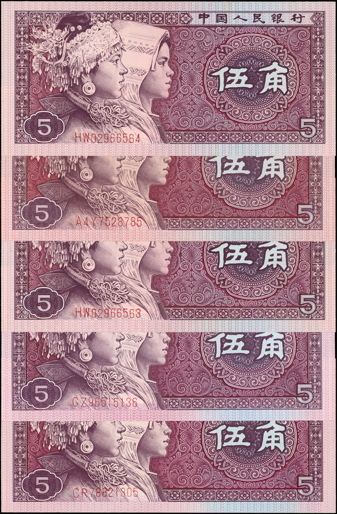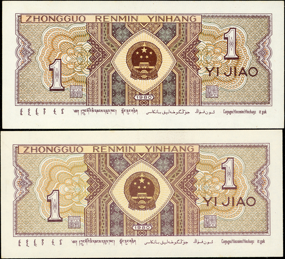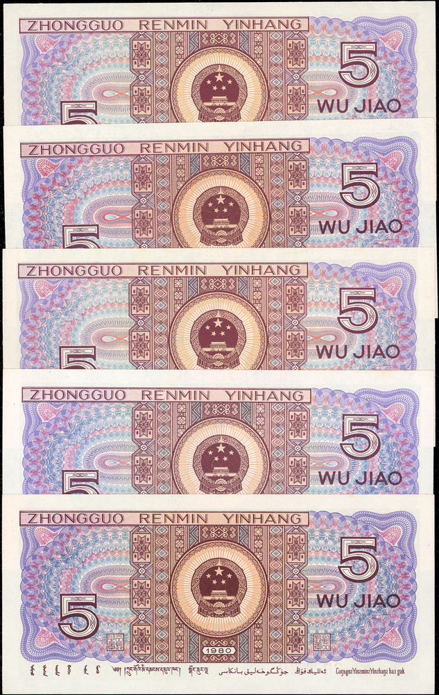 四版人民幣:(1)1980年1角2枚,全新;(2)1980年2角6枚,其中2枚70新,其餘99-全新;(3)1980年5角5枚,全新;(4)1980年1元3枚,其中1枚70新,其餘99-全新;(5)1980年2元3枚,其中1枚70新,其餘99新;(6)1980年5元1枚.10元2枚,95-99新;(7)1980年50元.100元各1枚,中折,88-90新(Page 89)