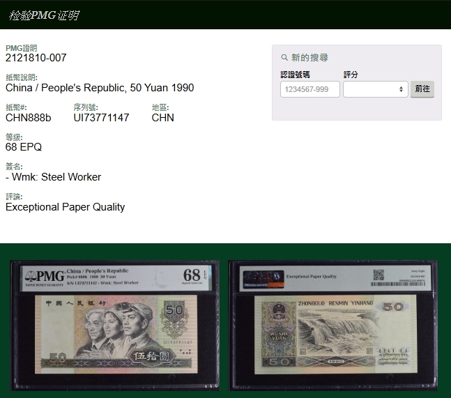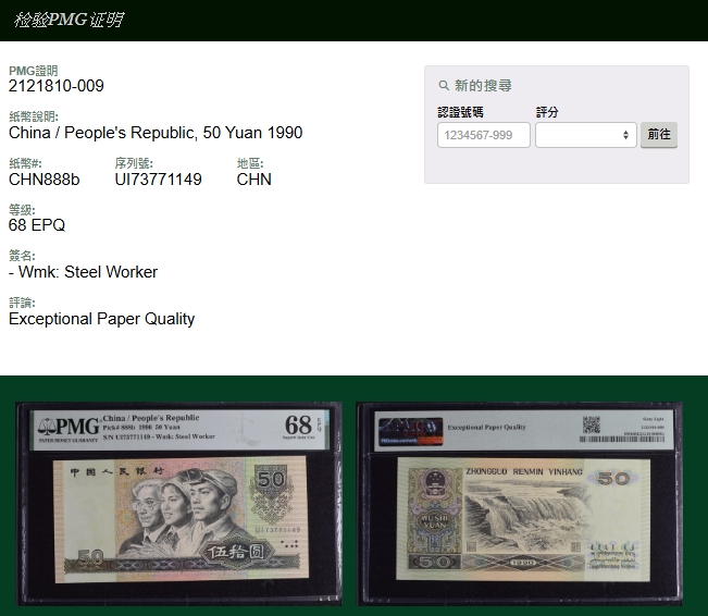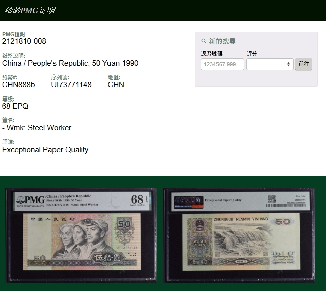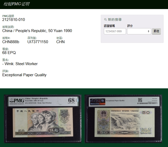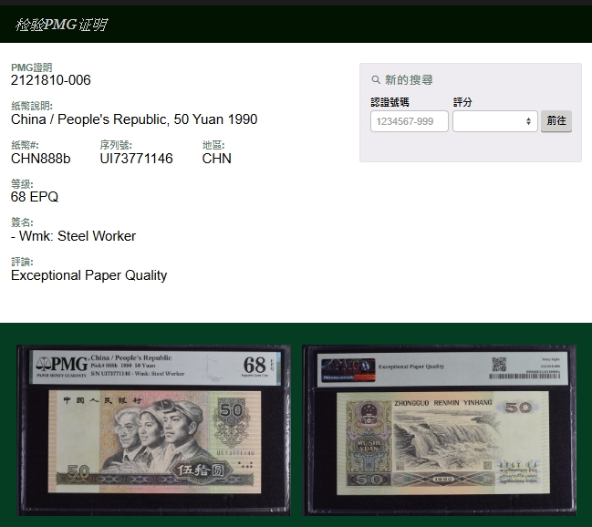 紙鈔分類 中國紙鈔清代~紙幣/股票/債券(8310-8323)『楊展孝』收藏~中央銀行銀元兑換券(8324-8380)民國~中央銀行紙幣(8381-8424)民國~中國銀行(8425-8448)民國~交通銀行(8449-8459)民國~中國農民銀行(8460-8462)民國~各省銀行券(8463-8491)民國~軍用鈔票(8492-8504)民國~地方券/錢莊票(8505-8510)民國~偽政權紙幣(8511-8519)民國金融票證~債券/股票(8520-8543)臺灣銀行~日治時期(8544-8552)臺灣銀行~老台幣(8553-8577)臺灣銀行~新台幣(8578-8679)臺灣銀行~限金門/限馬祖通用(8680-8694)臺灣銀行~限大陳島通用(8695-8696)臺灣/中央銀行~趣味號(8697-8706)中央銀行~三連鈔(8707-8709)臺灣各式金融票證(8710-8715)日本『山崎 修之亮』收藏~中國及外國紙幣(8716-8738)新中國紙幣解放區時期紙幣/債券(8739-8740)中國人民銀行~各版人民幣/外匯券/金融票證(8741-8759)世界各國紙幣日本紙幣(8760-8773)世界各國紙幣(A~Z)(8774-8783) 中國紙鈔 ↳清代~紙幣/股票/債券(8310-8323) ↳『楊展孝』收藏~中央銀行銀元兑換券(8324-8380) ↳民國~中央銀行紙幣(8381-8424) ↳民國~中國銀行(8425-8448) ↳民國~交通銀行(8449-8459) ↳民國~中國農民銀行(8460-8462) ↳民國~各省銀行券(8463-8491) ↳民國~軍用鈔票(8492-8504) ↳民國~地方券/錢莊票(8505-8510) ↳民國~偽政權紙幣(8511-8519) ↳民國金融票證~債券/股票(8520-8543) ↳臺灣銀行~日治時期(8544-8552) ↳臺灣銀行~老台幣(8553-8577) ↳臺灣銀行~新台幣(8578-8679) ↳臺灣銀行~限金門/限馬祖通用(8680-8694) ↳臺灣銀行~限大陳島通用(8695-8696) ↳臺灣/中央銀行~趣味號(8697-8706) ↳中央銀行~三連鈔(8707-8709) ↳臺灣各式金融票證(8710-8715) ↳日本『山崎 修之亮』收藏~中國及外國紙幣(8716-8738)新中國紙幣 ↳解放區時期紙幣/債券(8739-8740) ↳中國人民銀行~各版人民幣/外匯券/金融票證(8741-8759)世界各國紙幣 ↳日本紙幣(8760-8773) ↳世界各國紙幣(A~Z)(8774-8783) 點大圖放大展示,點小圖切換 中國人民銀行四版人民幣1990年50元士.農.工人物頭像,連號5枚,均評級:PMG Superb Gem Unc 68 EPQ(Page 90) 結標時間 2025-12-16 14:10:20 拍品編號:8752 起拍價:NT$10000 當前價:NT$10000 自動出價 直接出價 出價 系統將按出價級數,依序為您比(出)價至上限金額 提醒您:直接出價後不可將金額改低,只能改高,蟠龍無法降低您的出價,最高出價者無法取消出價 (查看出價說明) 得標說明:需按得標價另加10%佣金 當前加價幅度:NT$0元 (查看加價級數表) 回上頁 線上出價記錄 線上 0 人次,書面 0 人次 競價客戶 所在地 出價時間 出價金額 出價方式 問與答 目前尚無提問 我要提問 請先登入會員
