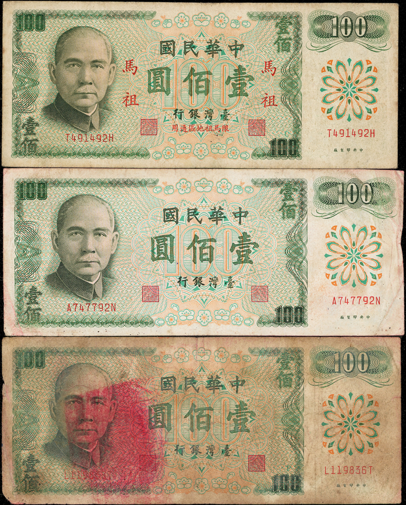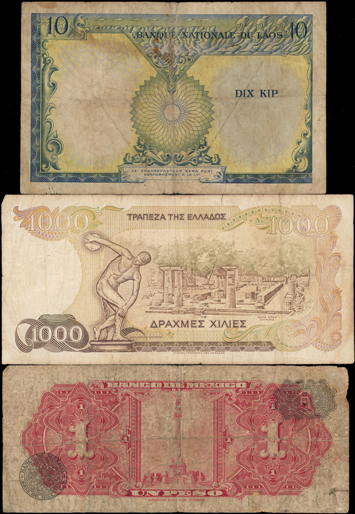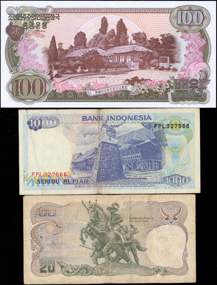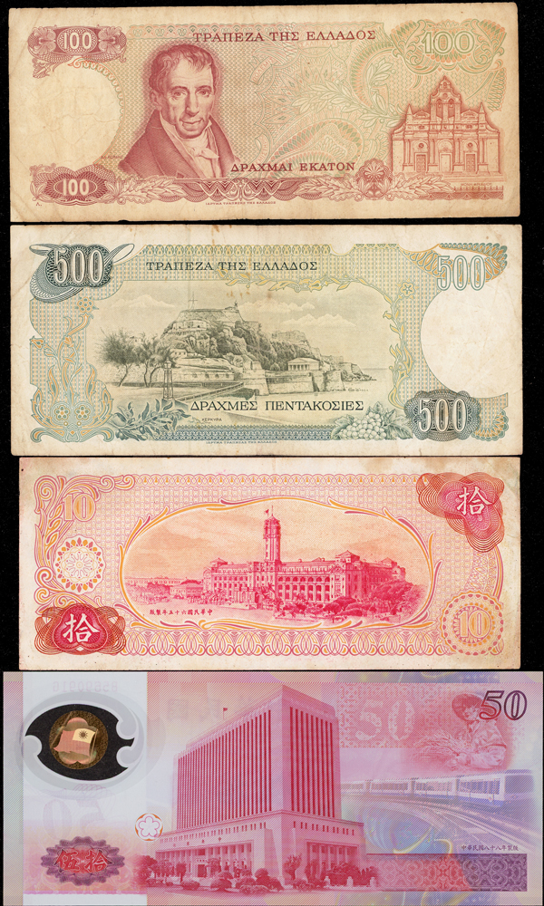 各國鈔券:(1)香港政府無年份1分7枚,全新;(2)日本板垣退助100元1枚,軍用手票乙號.丙號5元各1枚,77-80新;(3)瓜地馬拉2006年1元塑膠鈔3枚,全新;北韓1978年100元1枚,98新;(4)泰國20元.印尼1000元.寮國10元.墨西哥1元.希臘100.500.1000元各1枚,60-77新;(5)大陸中國銀行外匯券1979年1角12枚.1元3枚,70-90新;(6)台灣1972年100元F版2枚,60-70新;馬祖1972年100元1枚,75新;1999年50元塑膠鈔1枚,98新;1976年10元1枚,70新(Page 91)