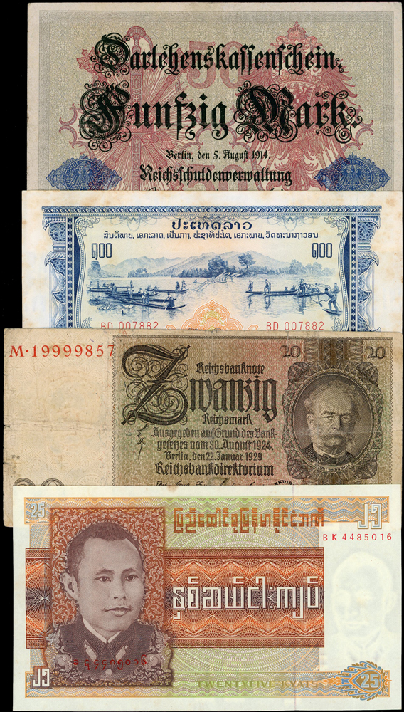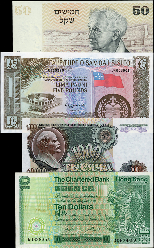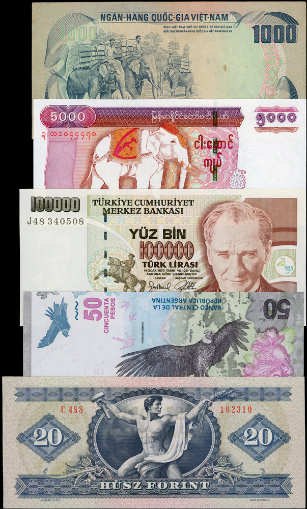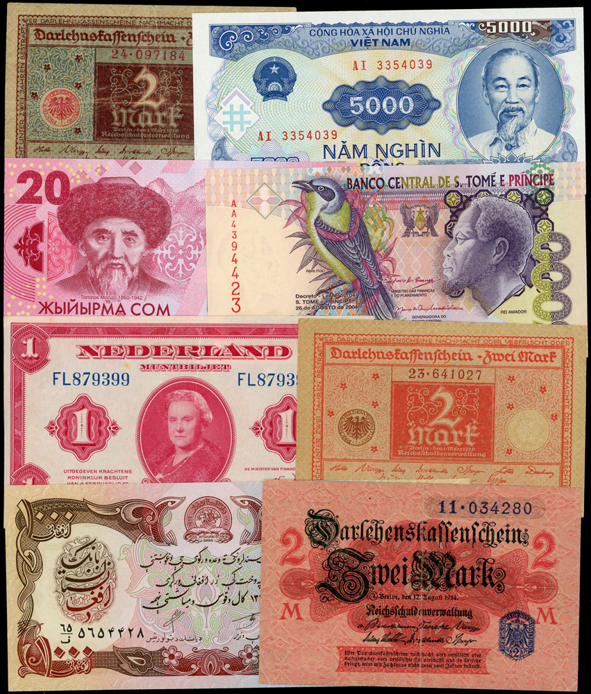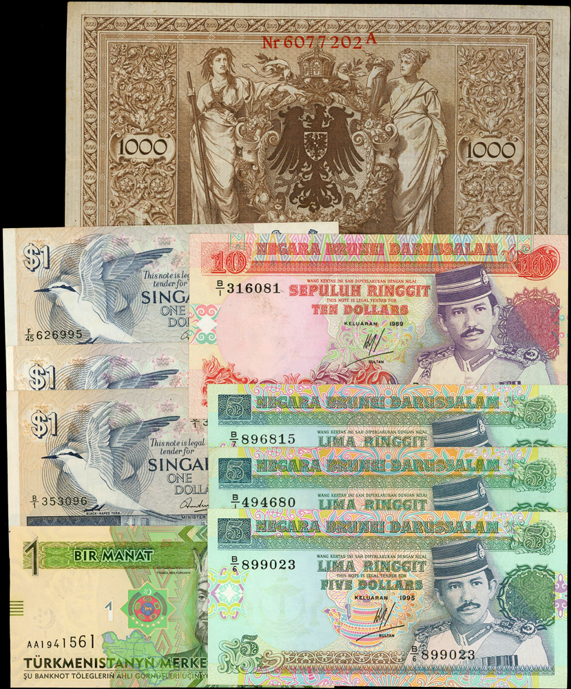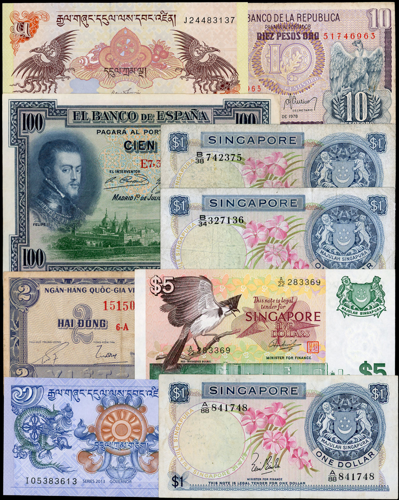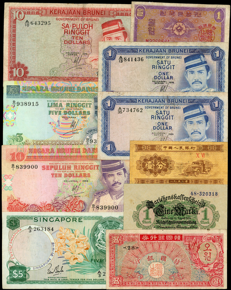 各國中早期鈔券70枚,國家包括有:汶萊.新加坡.德國.哥倫比亞.土庫曼.阿富汗.巴西.俄羅斯.韓國.緬甸.寮國.西班牙.印尼.新加坡.西薩摩亞.吉爾吉斯.土耳其.荷蘭.越南.匈牙利.聖多美普林西比.不丹.阿根廷.英國.羅馬尼亞.以色列等,品種豐富少數重複,約1/3有摺痕,75-80新,其餘90-全新