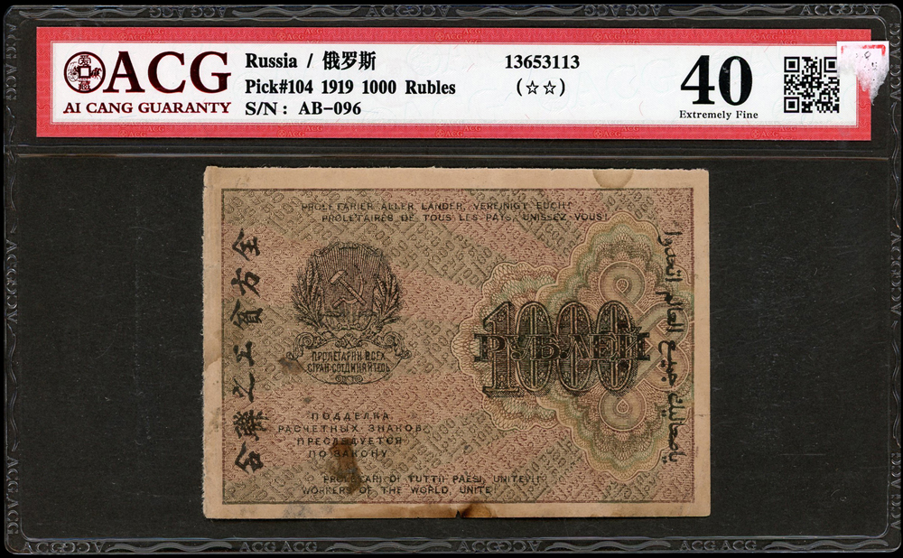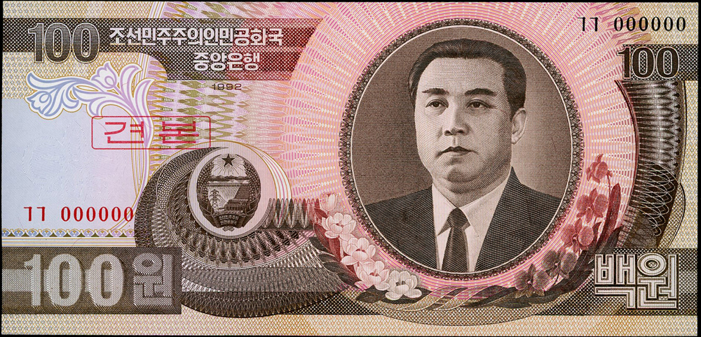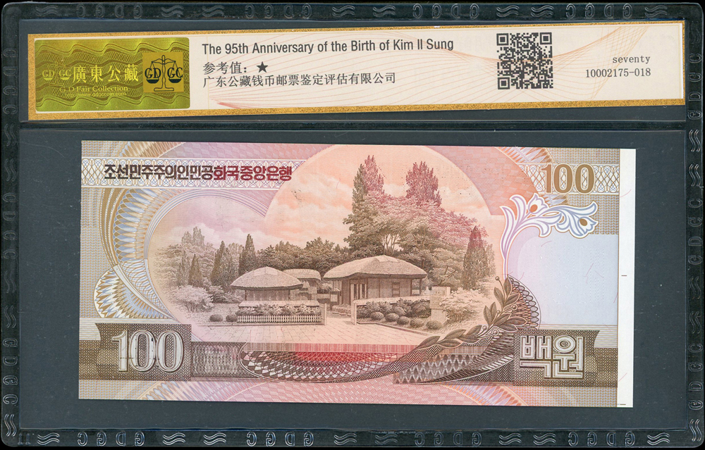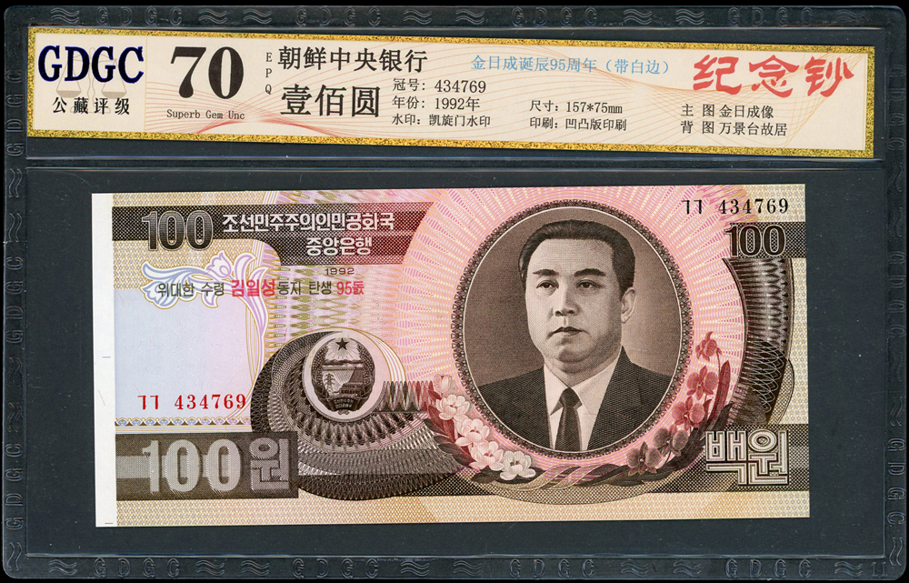 各國鈔:(1)北韓1992年100元,左側裁切未完全有0.5cm白邊,廣東公藏 Superb Gem Unc 70 EPQ;另樣鈔1枚,全新;共2枚;(2)俄羅斯1919年全方貧工之聯合1000盧布,廣州愛藏 Extremely Fine 40;(3)南斯拉夫1993年5000億,98新;(4)廈門勸業銀行無年份2角,98新;(5)美國2021年華盛頓像1元,99新