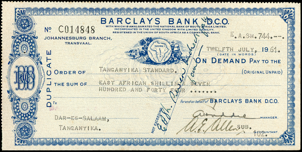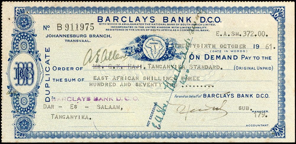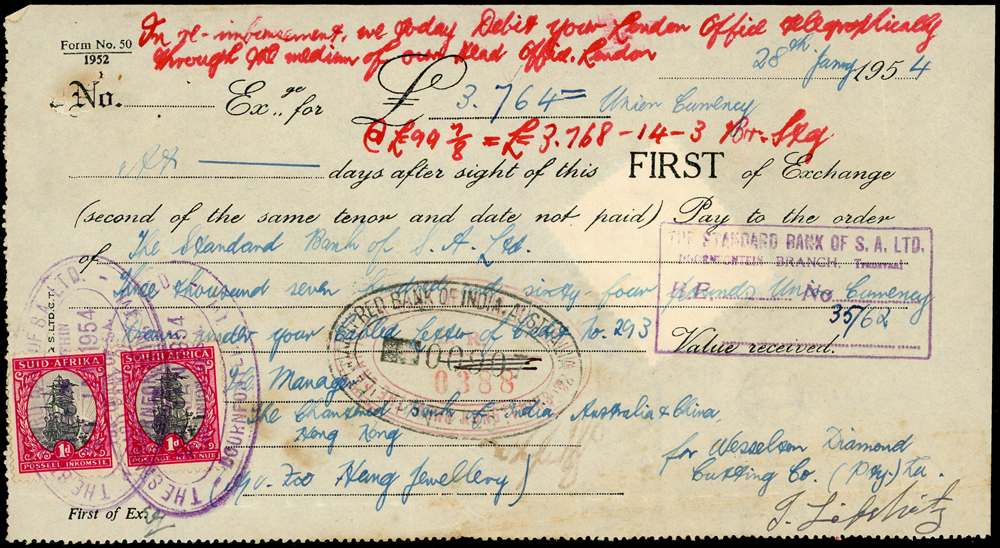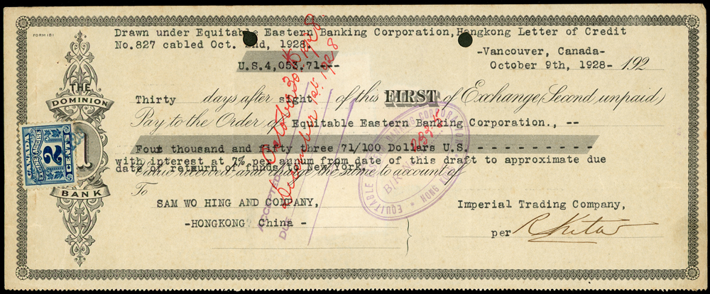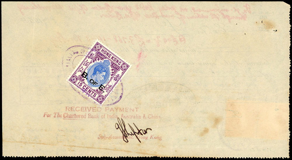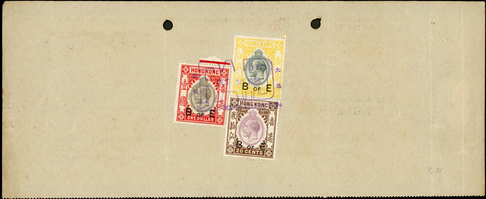 票券:(1)1961年英國巴克萊銀行匯票2張,簽用,支付地:坦尚尼亞;(2)1928年加拿大多明尼恩銀行匯票1張,簽用,正面貼有加拿大印花2分1枚,背面貼支付地香港愛德華七世印花郵票3枚銷印,有裝訂孔;(3)1954年南非銀行匯票1張,簽用,正面貼有印花2枚銷印,背面貼支付地香港愛德華七世印花郵票1枚銷印,有釘孔(Page 91)