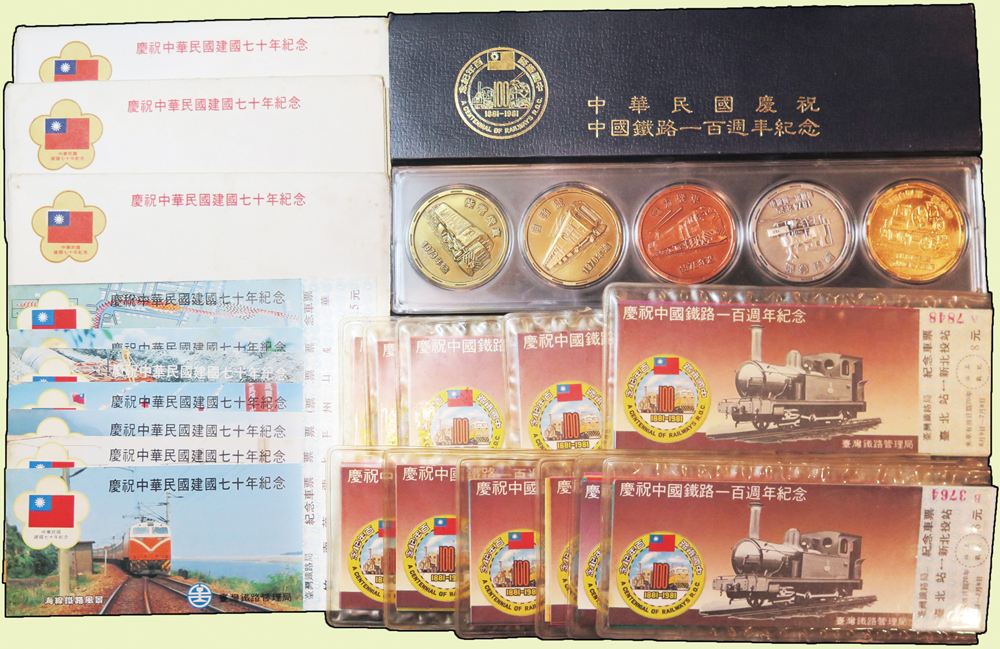 鐵道收藏品:(1)1981年慶祝中華民國建國七十週年紀念車票7張乙套,共3套,附原封套,未使用;(2)中華民國慶祝中國鐵路100周年紀念章,5枚乙套,原盒裝,美品;另其紀念車票10張乙套,共10套,另有9張缺1張成套,均未使用,附國防部承印塑套