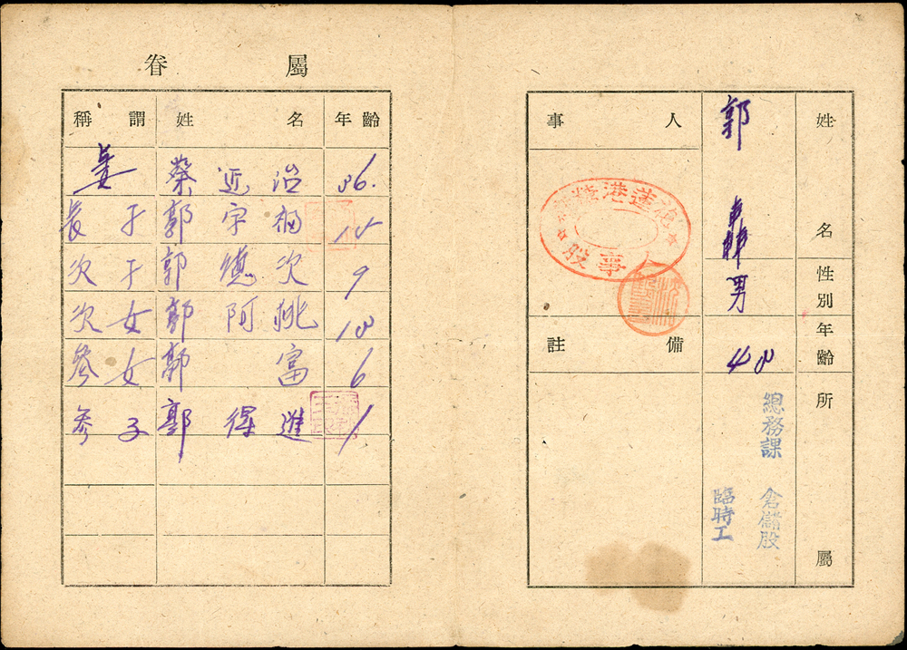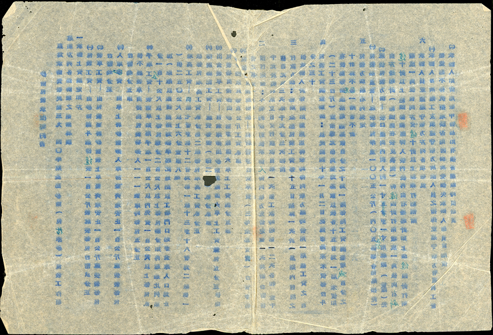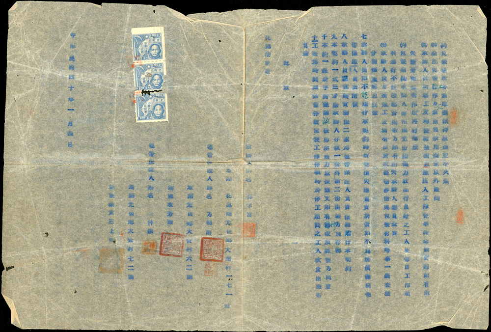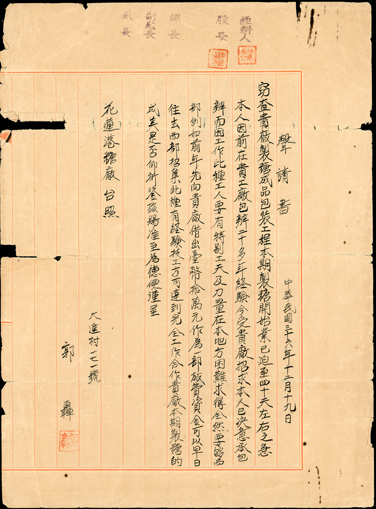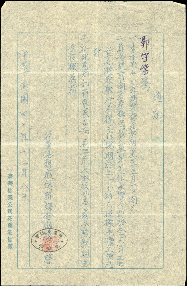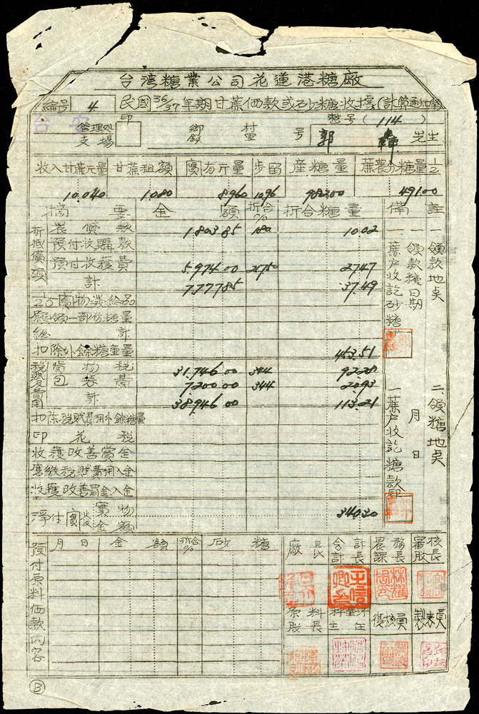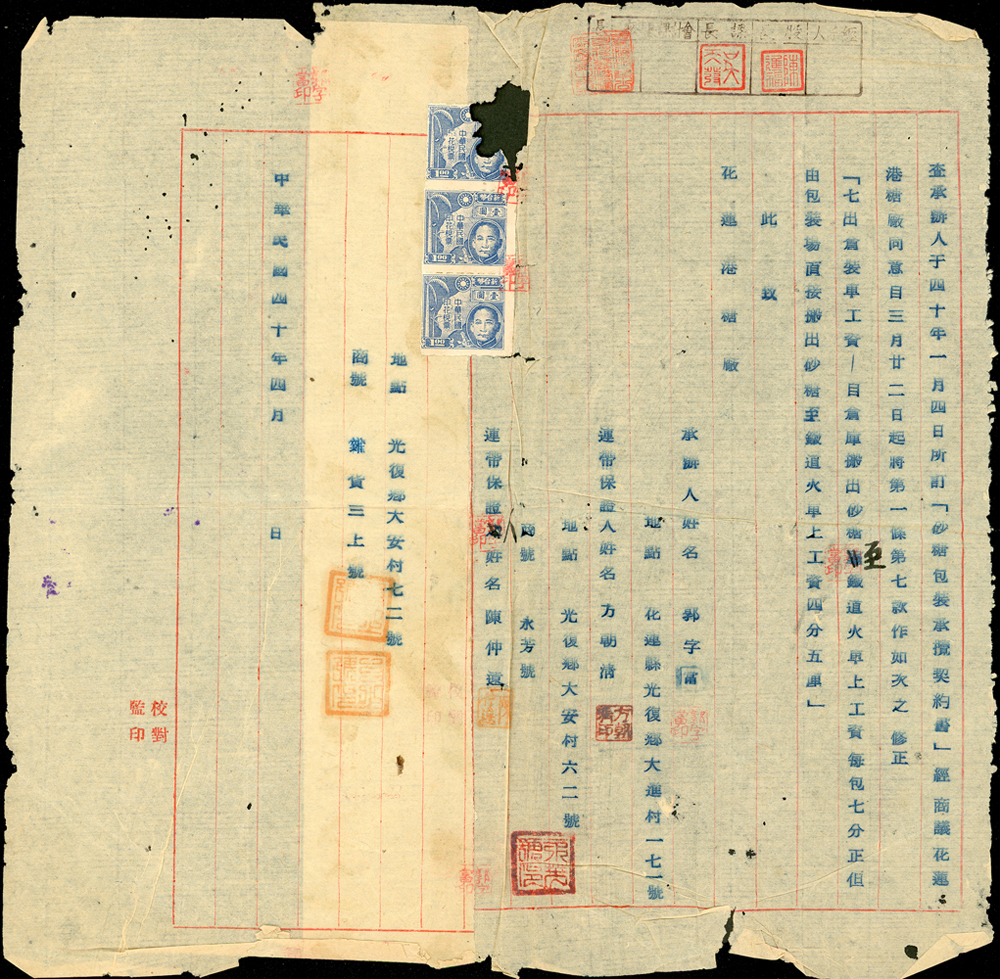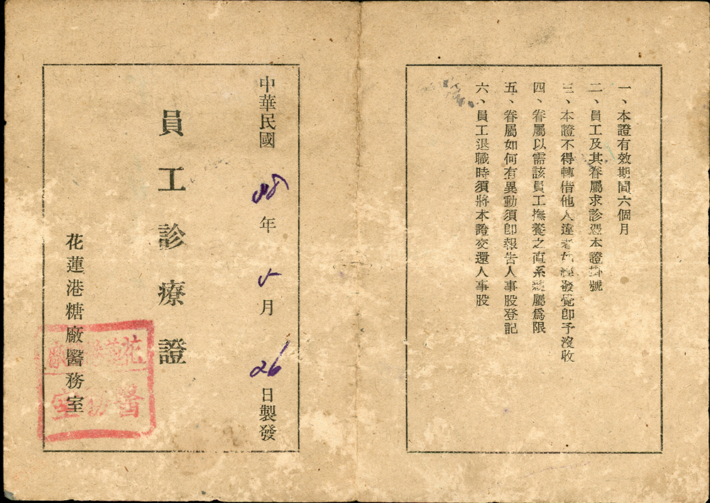 1947~1951年花蓮港糖廠單據5件:(1)員工診療證(18.2*13cm);(2)甘蔗價款或砂糖收據(25.3*17cm),上方微破損;(3)承攬通知(24.7*16.1cm);(4)聲請書(26.4*19.5cm),左側微破損;(5)砂糖包裝承攬契約書三頁,貼有孫像1元印花稅票銷印(微破);以上均已使用,摺痕,70-80新