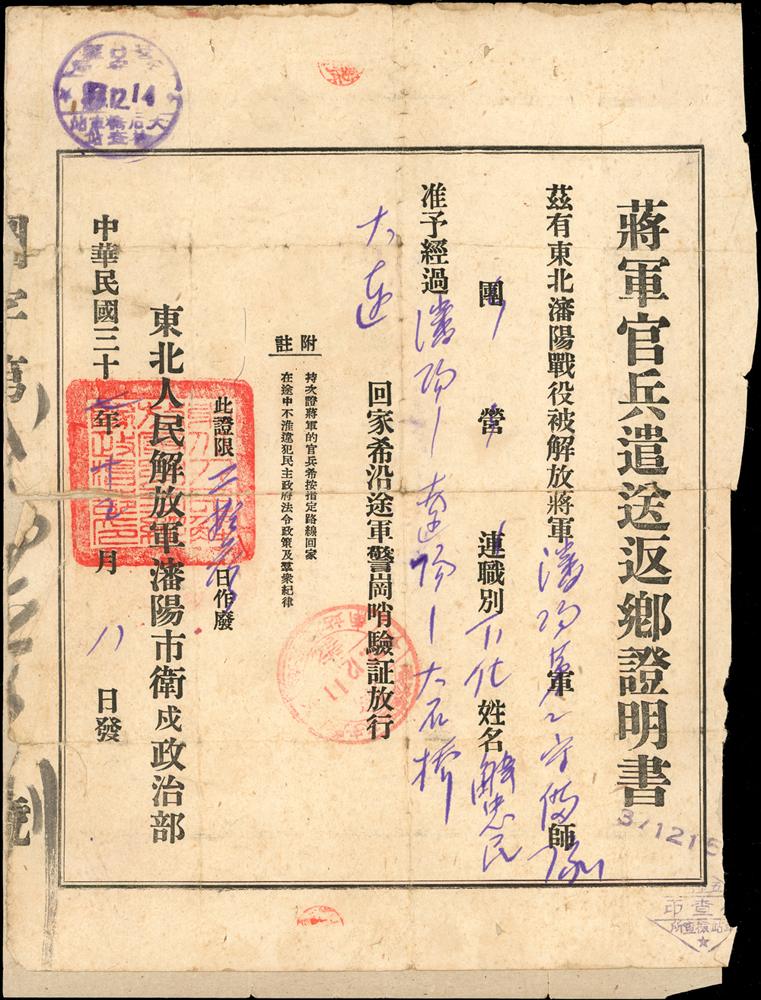 雜項與文獻分類 大清郵政 1911年以前清代~文獻(1113-1124)清代~臺灣文獻(1125-1135)印花稅票及集郵文獻印花稅票及單據(6366-6380)集郵文獻~華郵出版品(6381-6576)雜項收藏及幣鈔文獻幣鈔文獻~台灣及大陸出版品(8784-8794)雜項收藏~電話卡/紙質文獻(8795-8807)雜項收藏~國共內戰(8808-8816)雜項收藏~古籍善本(8817-8824) 大清郵政 1911年以前 ↳清代~文獻(1113-1124) ↳清代~臺灣文獻(1125-1135)印花稅票及集郵文獻 ↳印花稅票及單據(6366-6380) ↳集郵文獻~華郵出版品(6381-6576)雜項收藏及幣鈔文獻 ↳幣鈔文獻~台灣及大陸出版品(8784-8794) ↳雜項收藏~電話卡/紙質文獻(8795-8807) ↳雜項收藏~國共內戰(8808-8816) ↳雜項收藏~古籍善本(8817-8824) 點圖放大展示 1948年東北人民解放軍瀋陽市衛戌政治部製發,東北瀋陽戰役《蔣軍官兵遣送返鄉證明書》(25.7*19cm)一件,簽用,清晰完整,數折,背貼紙補強,77新(Page 94) 結標時間 2025-12-16 14:29:20 拍品編號:8809 起拍價:NT$100 當前價:NT$100 自動出價 直接出價 出價 系統將按出價級數,依序為您比(出)價至上限金額 提醒您:直接出價後不可將金額改低,只能改高,蟠龍無法降低您的出價,最高出價者無法取消出價 (查看出價說明) 得標說明:需按得標價另加10%佣金 當前加價幅度:NT$0元 (查看加價級數表) 回上頁 線上出價記錄 線上 0 人次,書面 0 人次 競價客戶 所在地 出價時間 出價金額 出價方式 問與答 目前尚無提問 我要提問 請先登入會員