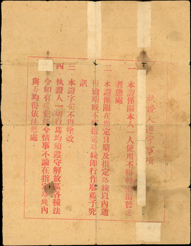1949年中國人民解放軍華東軍區解放官兵教導總團製發,徐淮戰役《遣送回籍證》(17.3*22.2cm)一件,內容為蔣軍官兵被解放軍教育後遣送回籍證明,清晰完整,數折,摺痕處裂損微污,背面紙張黏貼修補,70新(Page 94)