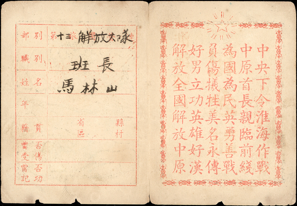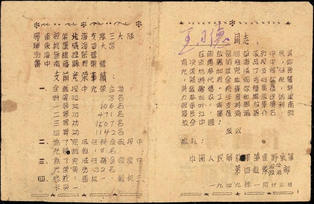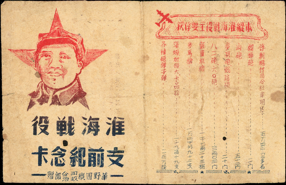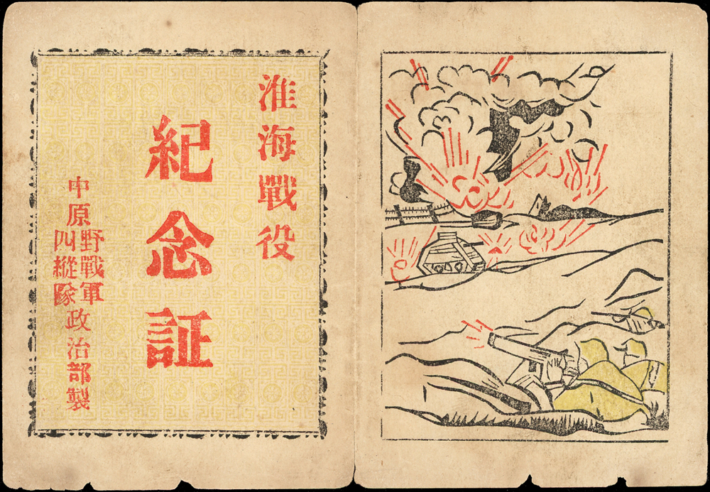 淮海戰役文獻二件:(1)1949年華野四縱政治司令部贈《支前紀念卡》(13.5*8.8cm),內印各隊光榮事蹟及軍備數量,摺痕,75新;(2)中原野戰軍四縱隊政治部製《紀念証》(13*9cm),已使用,75新(Page 93)