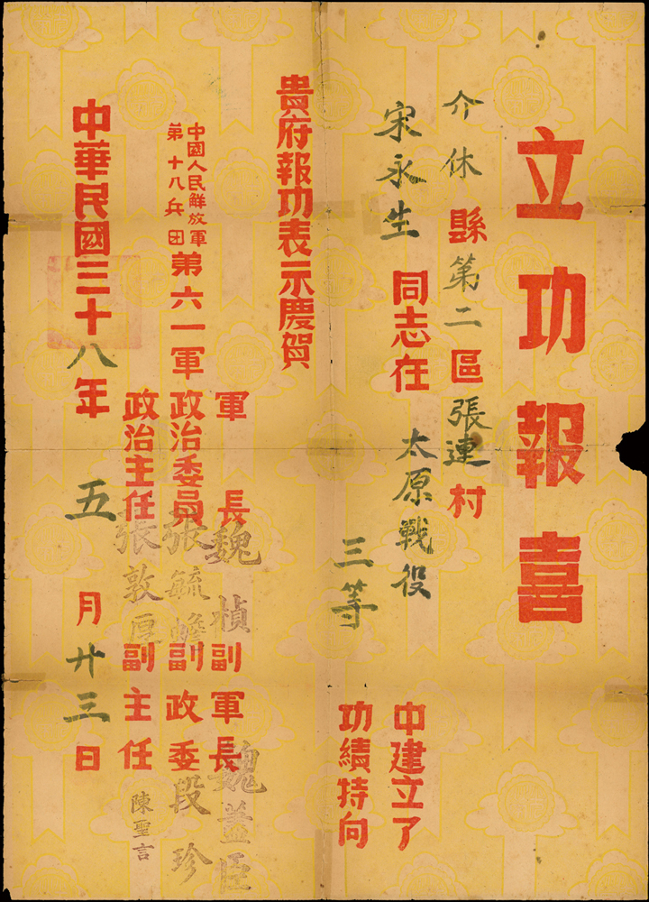 雜項與文獻分類 大清郵政 1911年以前清代~文獻(1113-1124)清代~臺灣文獻(1125-1135)印花稅票及集郵文獻印花稅票及單據(6366-6380)集郵文獻~華郵出版品(6381-6576)雜項收藏及幣鈔文獻幣鈔文獻~台灣及大陸出版品(8784-8794)雜項收藏~電話卡/紙質文獻(8795-8807)雜項收藏~國共內戰(8808-8816)雜項收藏~古籍善本(8817-8824) 大清郵政 1911年以前 ↳清代~文獻(1113-1124) ↳清代~臺灣文獻(1125-1135)印花稅票及集郵文獻 ↳印花稅票及單據(6366-6380) ↳集郵文獻~華郵出版品(6381-6576)雜項收藏及幣鈔文獻 ↳幣鈔文獻~台灣及大陸出版品(8784-8794) ↳雜項收藏~電話卡/紙質文獻(8795-8807) ↳雜項收藏~國共內戰(8808-8816) ↳雜項收藏~古籍善本(8817-8824) 點圖放大展示 太原戰役:1949年《立功報喜》(39*54.5cm)一件,內容為慶賀宋同志於太原戰役建立功績,中國人民解放軍第十八兵團第六一軍製發,完整清晰,數折,摺痕處部分斷開膠帶黏貼補強,70新(Page 94) 結標時間 2025-12-16 14:31:20 拍品編號:8815 起拍價:NT$100 當前價:NT$100 自動出價 直接出價 出價 系統將按出價級數,依序為您比(出)價至上限金額 提醒您:直接出價後不可將金額改低,只能改高,蟠龍無法降低您的出價,最高出價者無法取消出價 (查看出價說明) 得標說明:需按得標價另加10%佣金 當前加價幅度:NT$0元 (查看加價級數表) 回上頁 線上出價記錄 線上 0 人次,書面 0 人次 競價客戶 所在地 出價時間 出價金額 出價方式 問與答 目前尚無提問 我要提問 請先登入會員