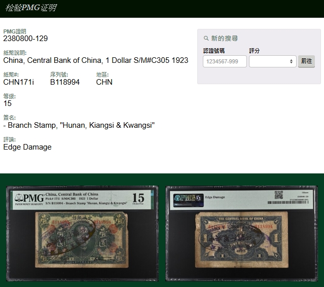 蟠龍拍賣網-中央銀行十二年湘贛桂通用券1元塗改成廣州總行,流通兌現時被發現後加蓋中央銀行總行湘贛桂三省通用券橢圓戳,鈔號B118994。此種1元的橢圓戳加蓋僅紀錄有3枚,這3枚中僅此一枚為廣州總行加蓋。PMG 15 Edge Damage。蘇駿「中央銀行紙幣•壹」第153頁原件。楊著「中央銀行銀元兑換券」第33頁(Page 40)