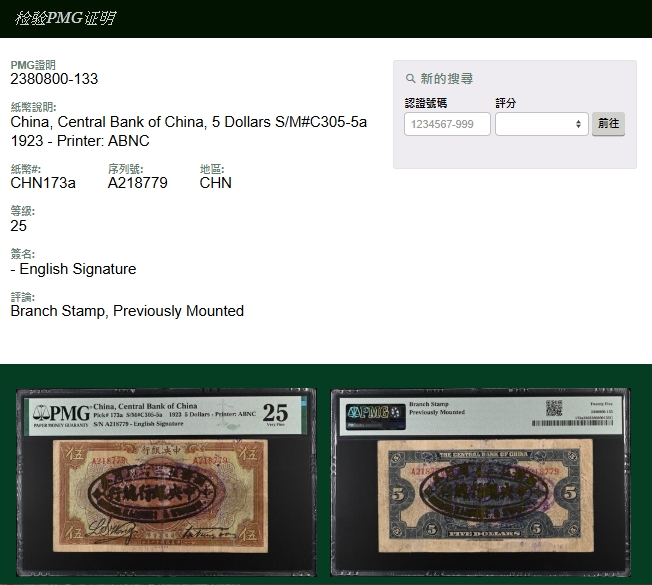 蟠龍拍賣網-中央銀行十二年湘贛桂通用券5元被塗抹掉,在銀行兌現時被發現後,加蓋中央銀行總行湘贛桂三省通用券橢圓戳,鈔號A218779。此種5元的橢圓戳加蓋僅紀錄有5枚。PMG 25。楊著「中央銀行銀元兑換券」第34頁(Page 40)