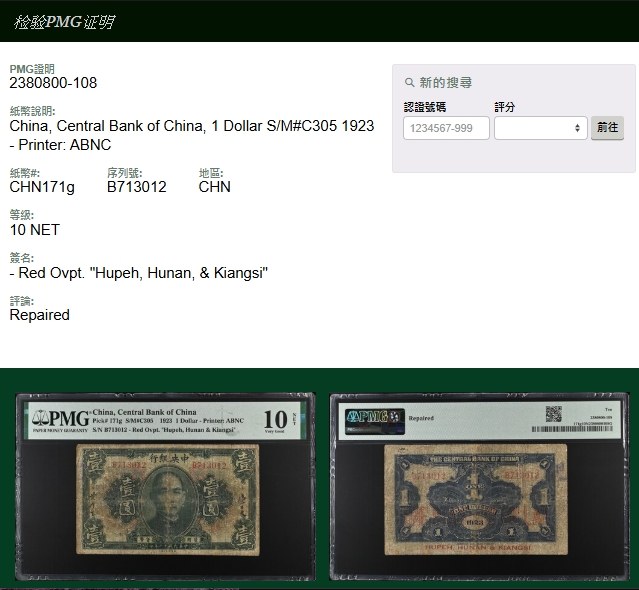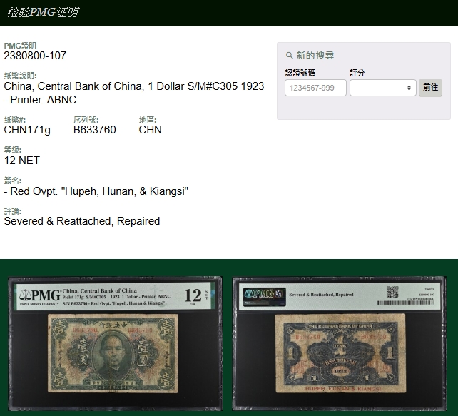 蟠龍拍賣網-中央銀行十二年鄂湘贛三省通用大洋券1元,共2枚,鈔號B633760(PMG 12NET),B713012(PMG10NET)。非常少見,但品相差。楊著「中央銀行銀元兑換券」第39頁(Page 41)